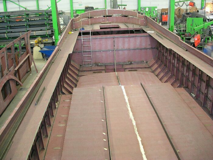 Vast stalen stuurhuis, open kuip met banken achterop, kuip en stuurhuis bevinden zich op een niveau, het dek in het achterschip is recht tot ongeveer midscheeps en loopt dan met de zeeg mee omhoog naar het voordek.